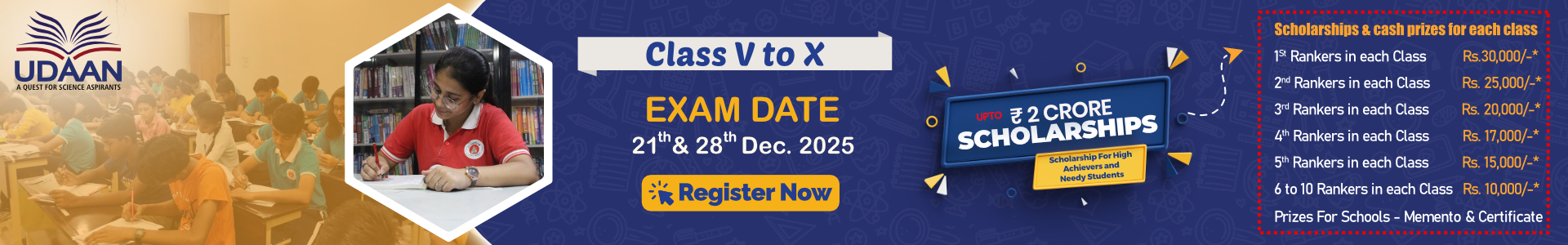 The objective of Udaan is to inculcate awareness in the students to succeed in various scholarship-based examinations like NTSE, NSTSE, KVPY and Olympiads, especially for those in class 8th, 9th and 10th. Appearing for Udaan will allow students to confidently take up career-oriented competitive examinations like JEE Main (AIEEE), JEE Advanced (IIT-JEE), AIIMS, NEET and various other engineering as well as medical entrance examinations. In fact, competing in Udaan allows students to build a strong foundation in subjects like Mathematics, Science and Mental Ability at an early stage and these abilities help them in performing better at other competitive exams like CAT, MAT as well as Civil Services.